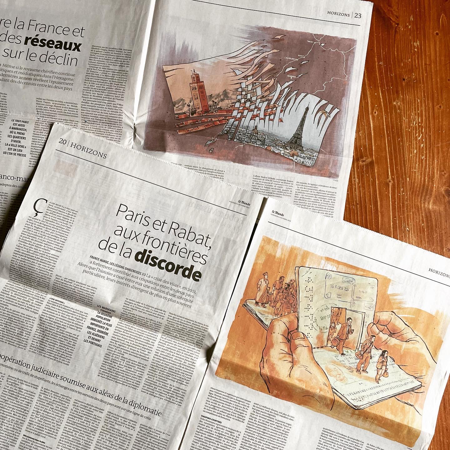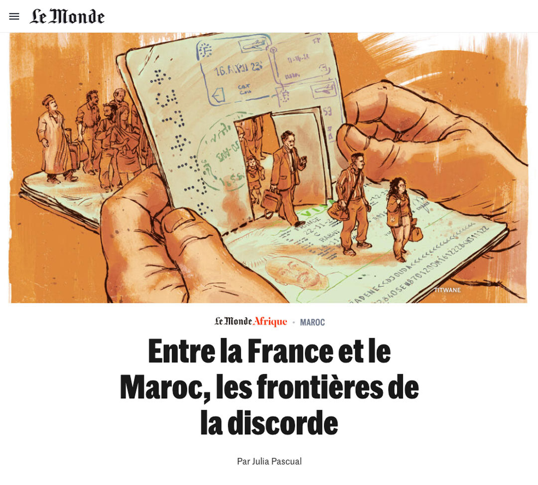 3 illustrations, avec reprise en Une, pour le Monde sur les relations difficiles entre la France et le Maroc.